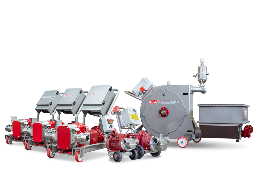 Pour le pompage des produits, Enoveneta propose différentes solutions adaptables à toutes les phases de la vinification: Pompe à rotor elliptique, mohno, à roue flexible, à lobes et péristaltique.