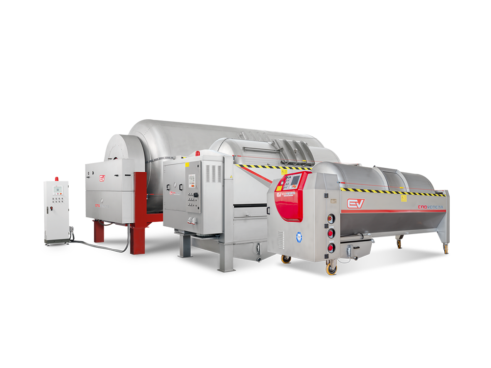 Pour la phase de pressurage Enoveneta propose une série de solutions technologiques qui vont des pressoirs hydrauliques aux pressoirs pneumatiques, à tambour ouvert et à tambour fermé. En outre, différents solutions sont également disponibles pour le transport du marc de raisin.